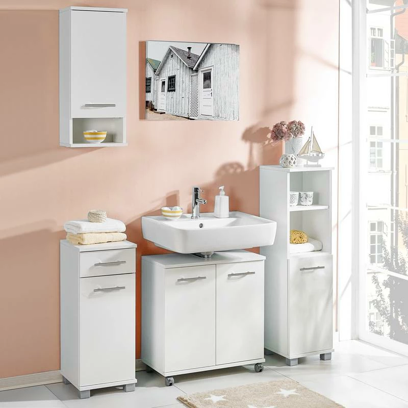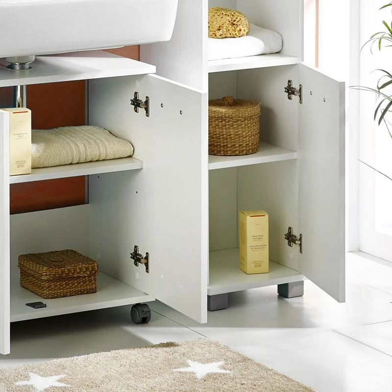 - 1 meuble sous vasque : 2 portes renfermant 1 tablette d’étagère et 4 roulettes