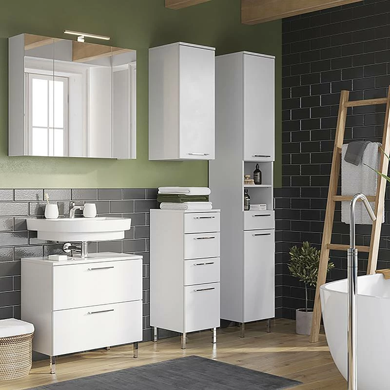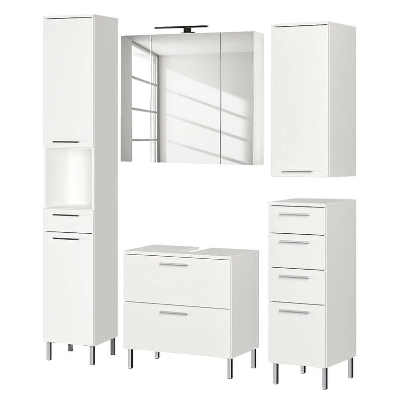 - Contenu de la livraison : Ensemble de salle de bain comprenant 1 meuble sous lavabo, 1 meuble haut, 1 meuble bas, 1 colonne de salle de bain et 1 armoire de toilette avec éclairage et combinaison interrupteur et prise