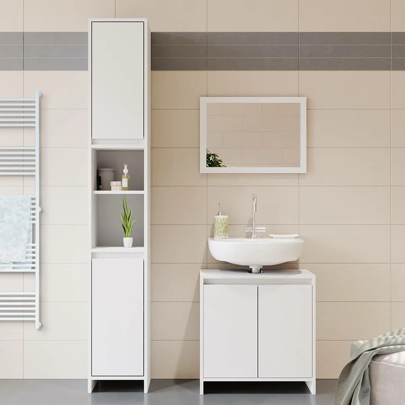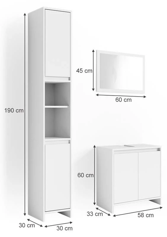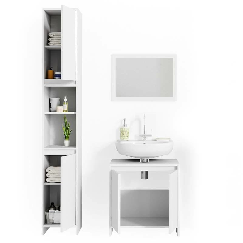 - Contenu de la livraison : • 1x miroir • 1x meuble sous-vasque • 1x meuble haut Décoration non incluse