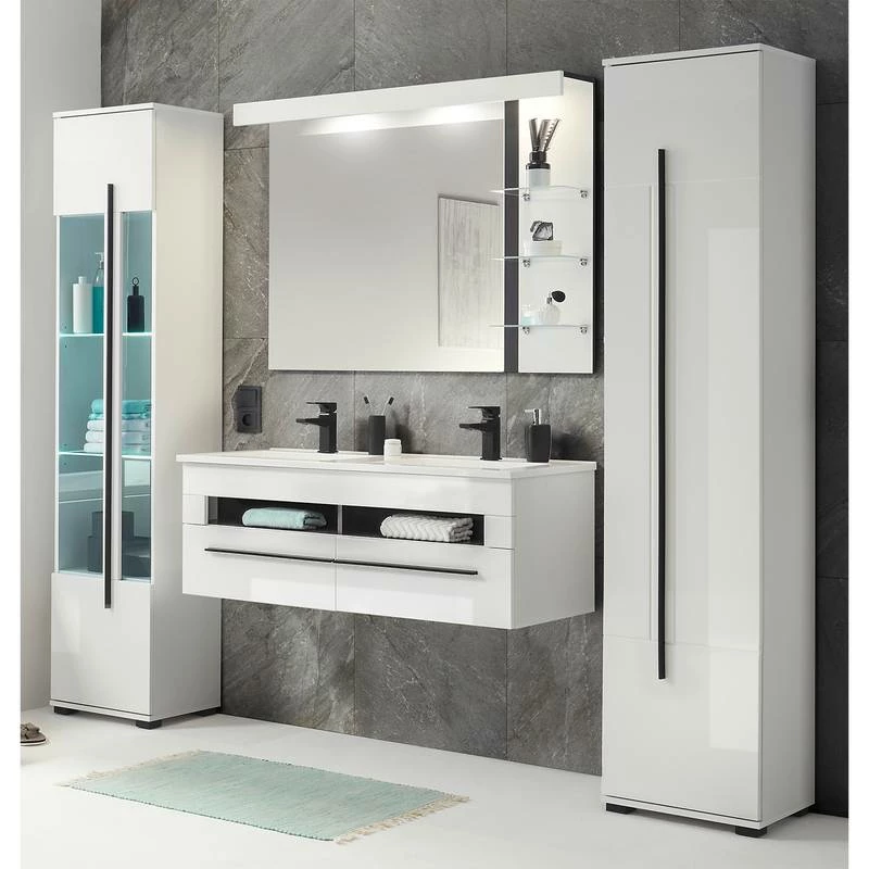 - Contenu de la livraison : Salle de bain comprenant 1 meuble double avec 2 vasques en fonte minérale, 1 colonne de salle de bain (charnières à gauche), 1 colonne de salle de bain (charnières à droite) et 1 miroir avec éclairage LED