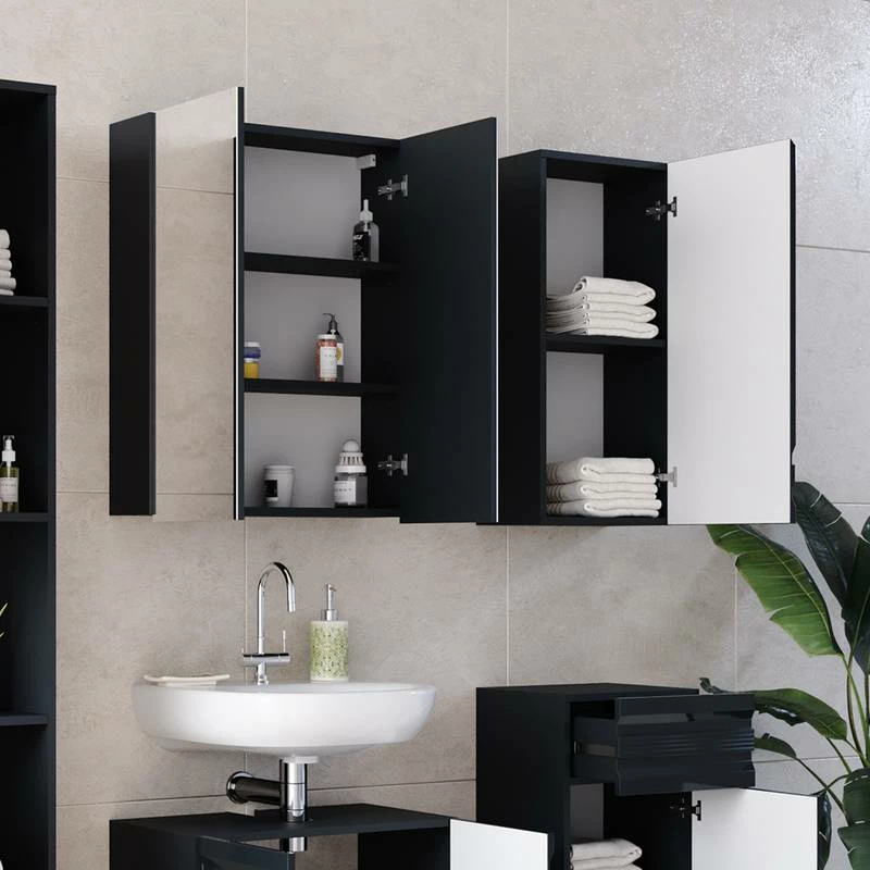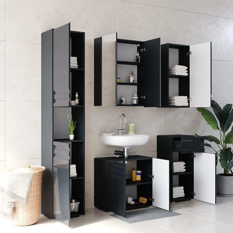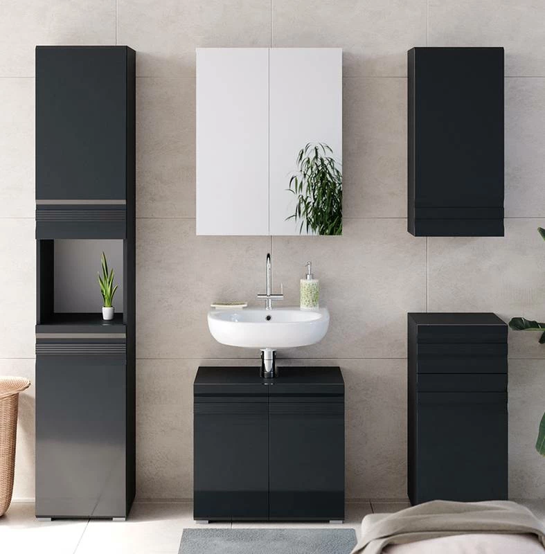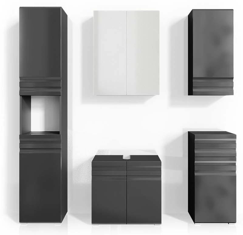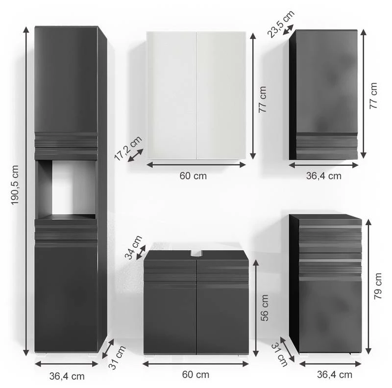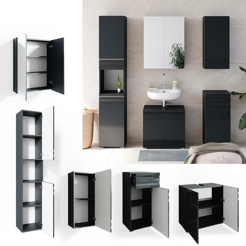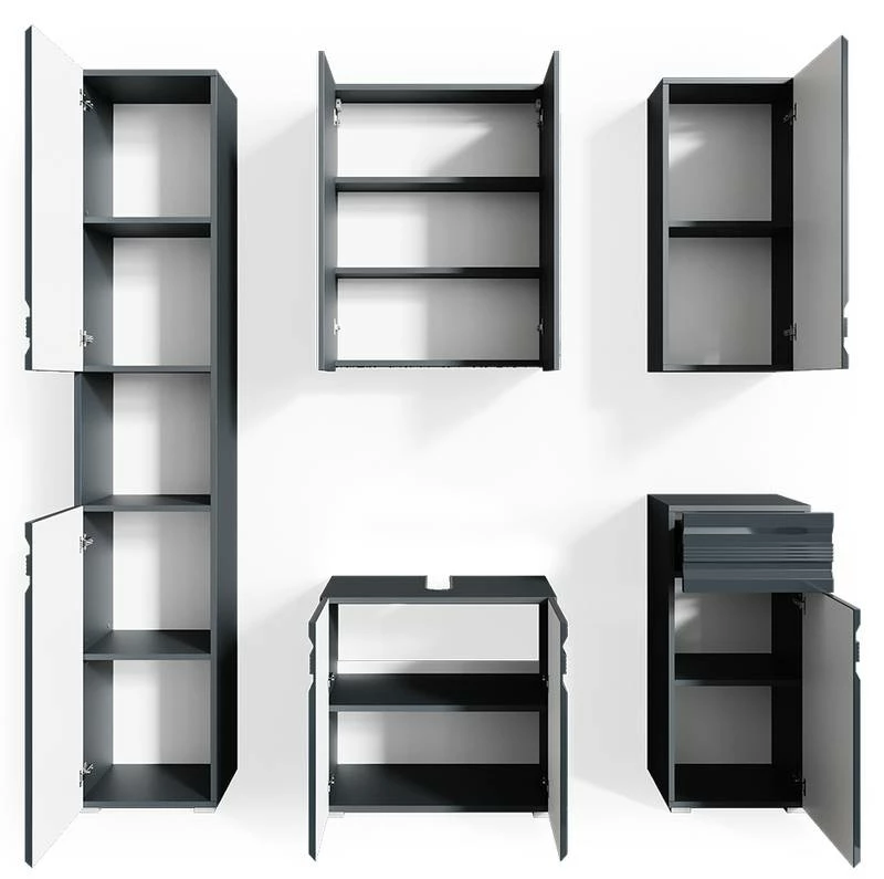 - Contenu de la livraison : Set 5 • 1x meuble sous-vasque • 1x armoire de toilette • 1x meuble haut • 1x chiffonnier • 1x meuble à suspendre Décoration non incluse