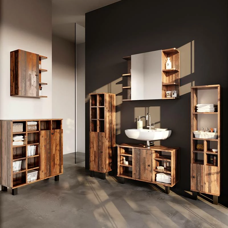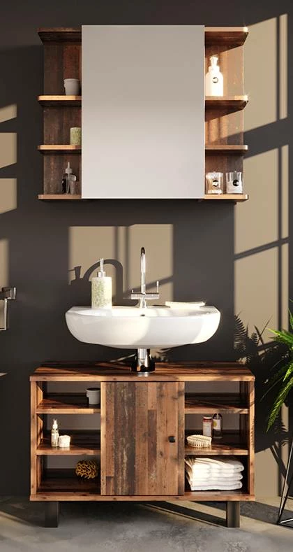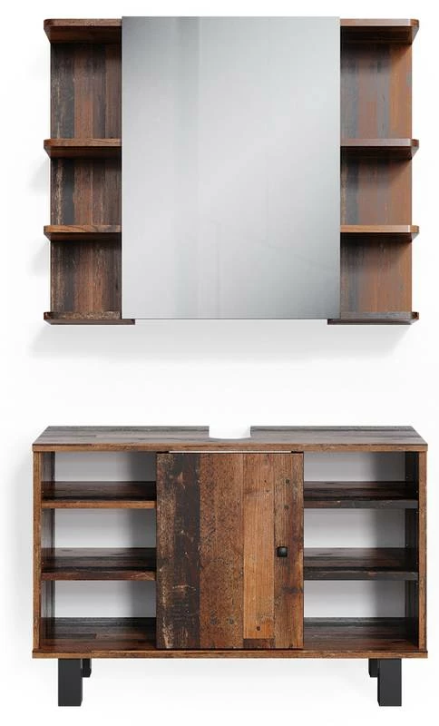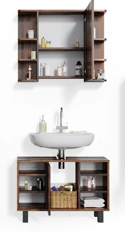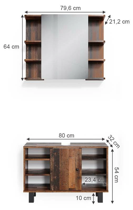 - Contenu de la livraison : • 1x armoire de toilette • 1x meuble sous-vasque Décoration non incluse