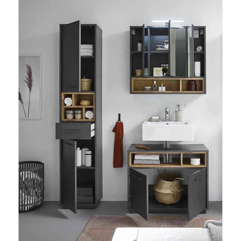 - Contenu de la livraison : Salle de bain comprenant 1 colonne de salle de bain, 1 meuble sous lavabo et 1 armoire de toilette avec éclairage LED, interrupteur et prise (température de couleur : blanc froid)