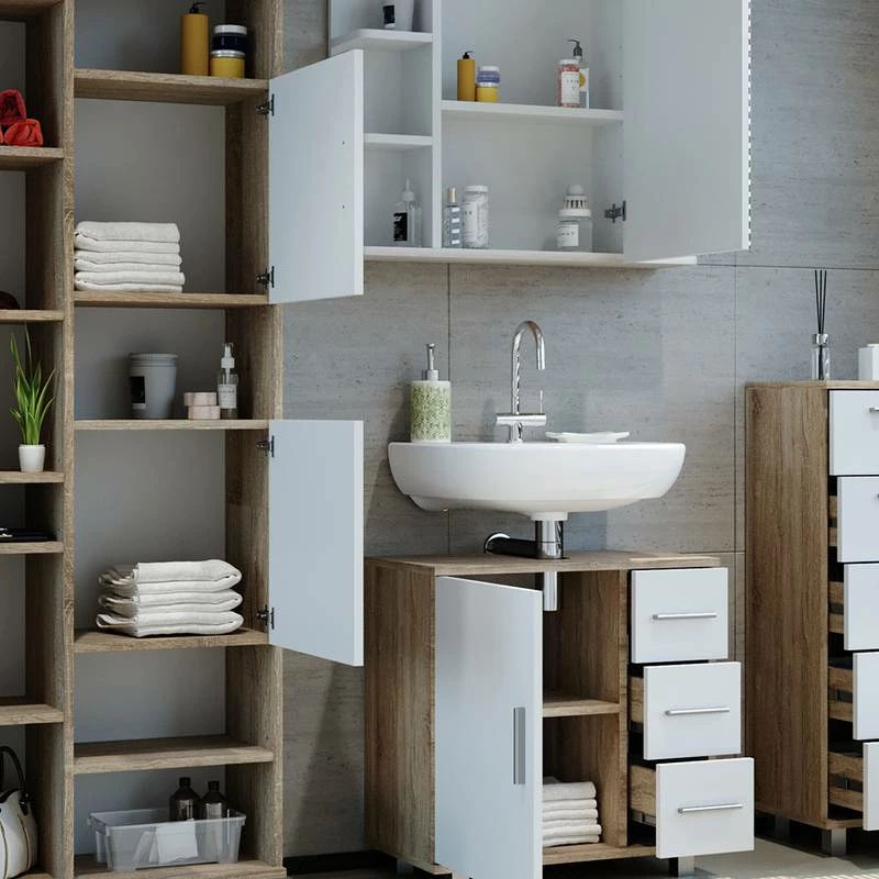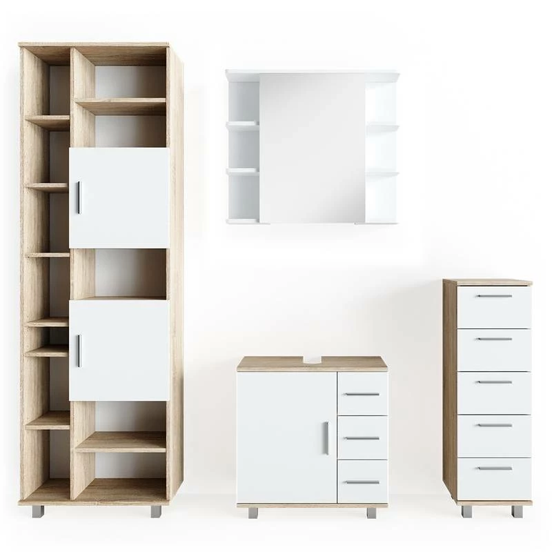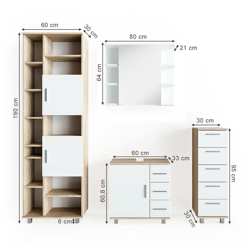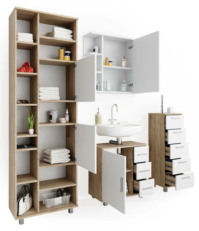 - Contenu de la livraison : • 1x armoire de toilette• 1x meuble sous-vasque• 1x chiffonnier• 1x meuble hautDécoration non incluse