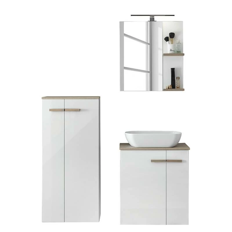 - Salle de bain comprenant 1 meuble avec vasque en céramique, 1 armoire de salle de bain et 1 miroir avec éclairage