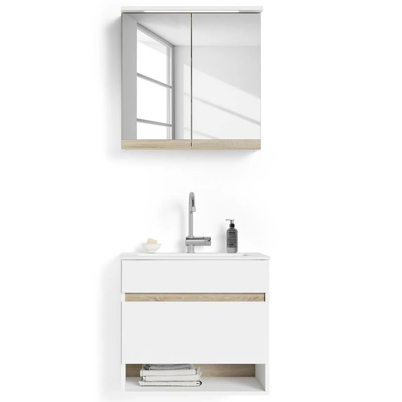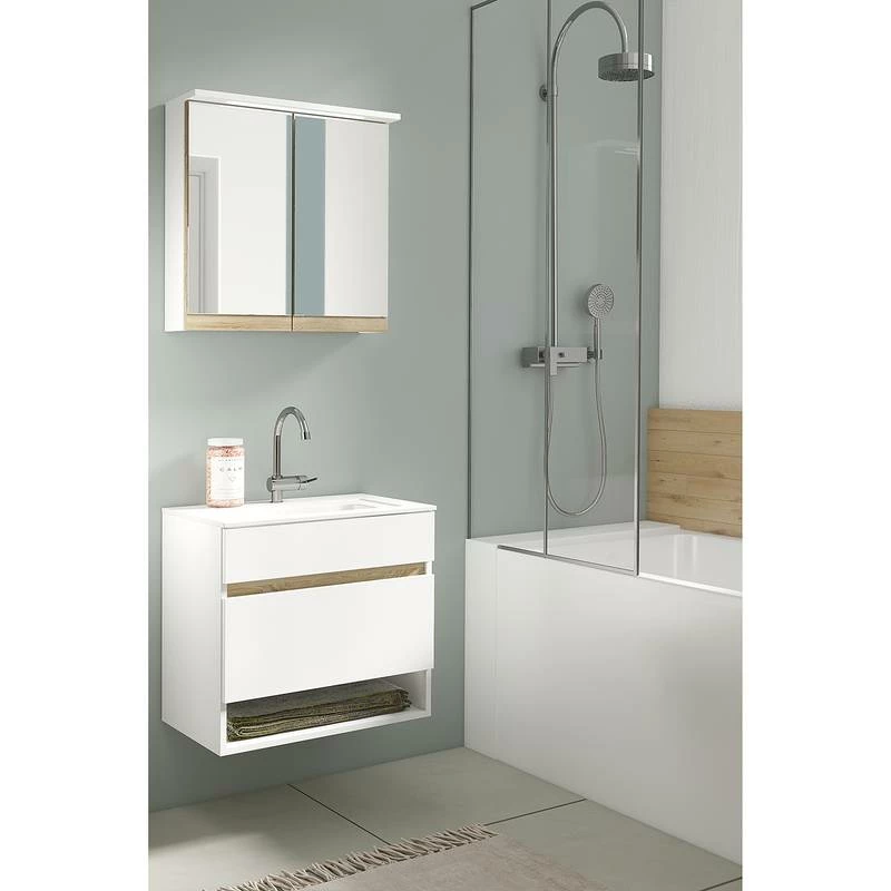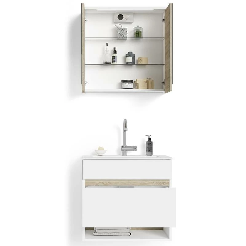 - Contenu de la livraison : Salle de bain comprenant 1 meuble avec vasque en fonte minérale et 1 armoire de toilette avec éclairage