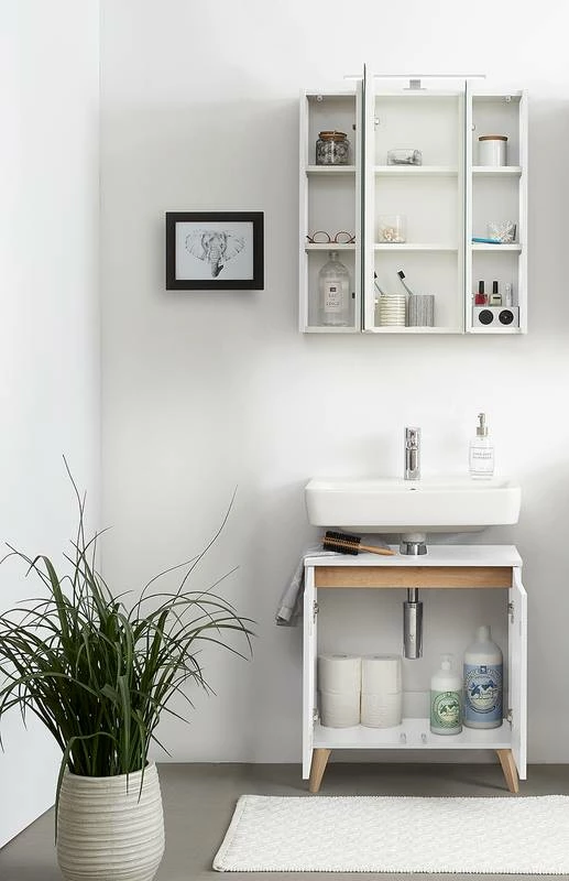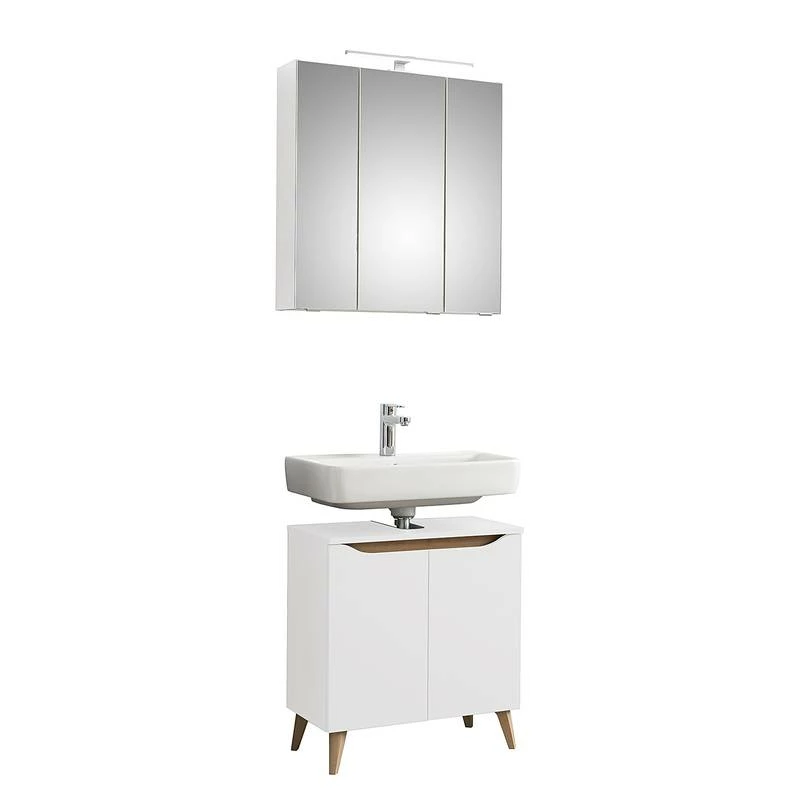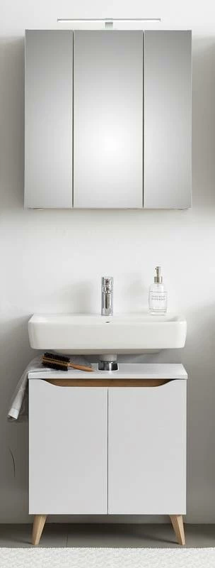 - Contenu de la livraison : Salle de bain composée de 1 armoire de toilette et 1 meuble sous lavabo, avec pieds et éclairage inclus, sans accessoires