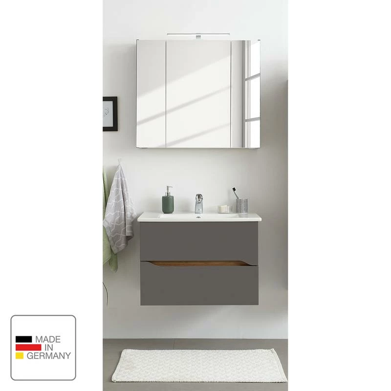 - Contenu de la livraison : Salle de bain comprenant 1 meuble avec vasque en céramique et 1 armoire de toilette avec éclairage