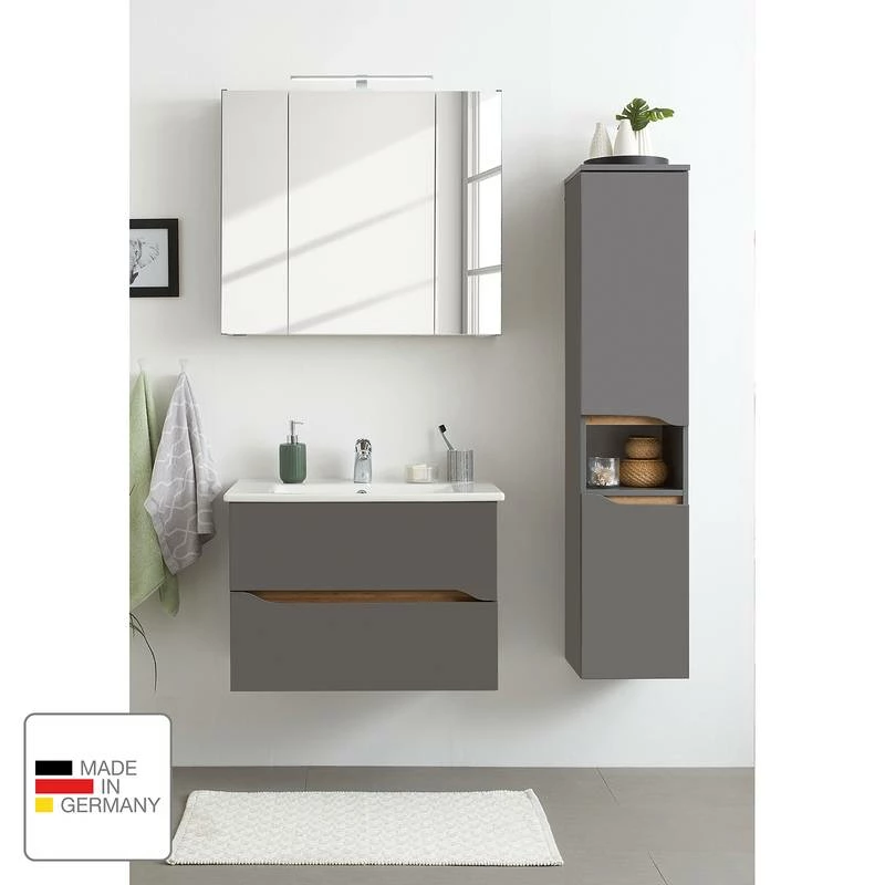 - Contenu de la livraison : Salle de bain comprenant 1 meuble avec vasque en céramique, 1 armoire de salle de bain et 1 armoire de toilette avec éclairage