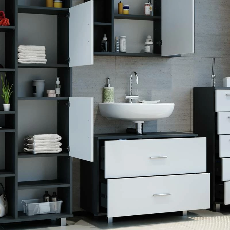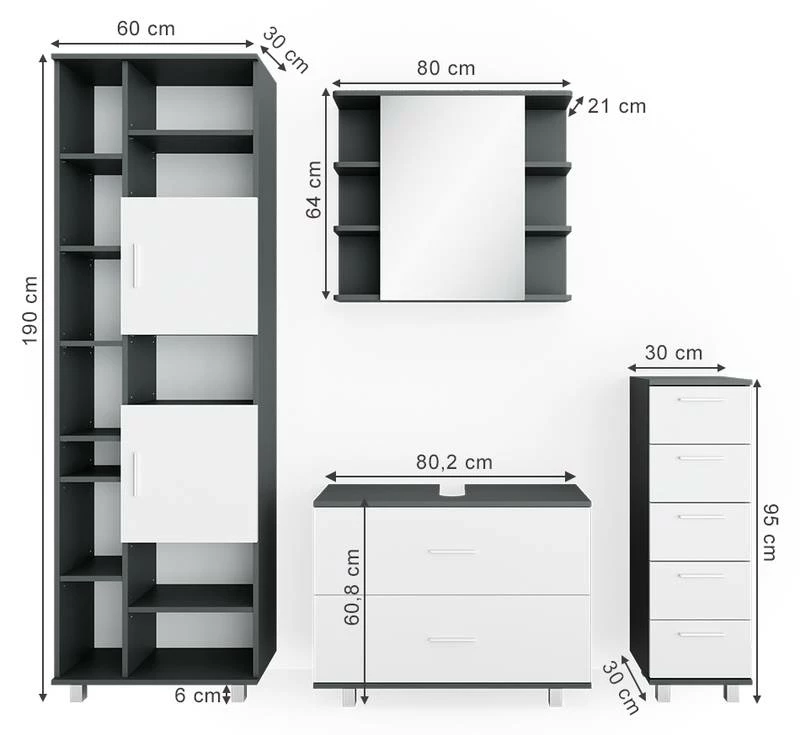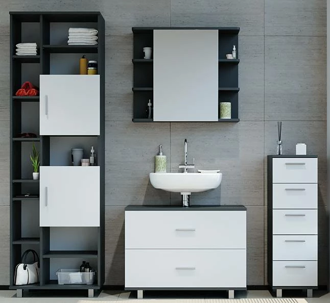 - Contenu de la livraison : • 1x armoire de toilette• 1x meuble sous-vasque• 1x chiffonnier• 1x placardDécoration non incluse